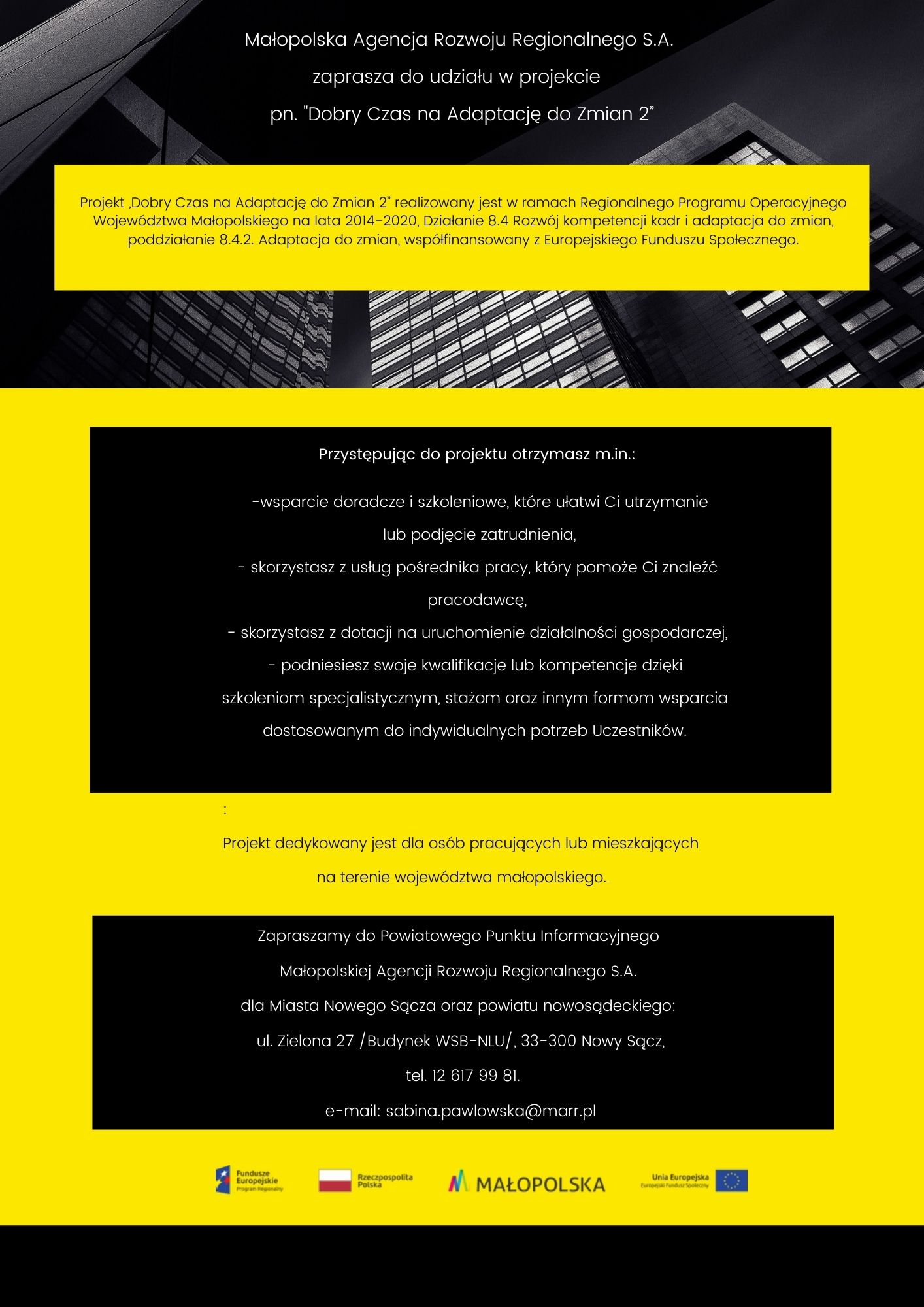 Informacja o realizowanym przez Małopolską Agencję Rozwoju Regionalnego S.A. w Krakowie projektu pn. „Dobry Czas na Adaptację do Zmian 2”. Projekt dedykowany jest dla osób pracujących lub mieszkających na terenie województwa małopolskiego. Więcej informacji: https://www.marr.pl/dcaz2/