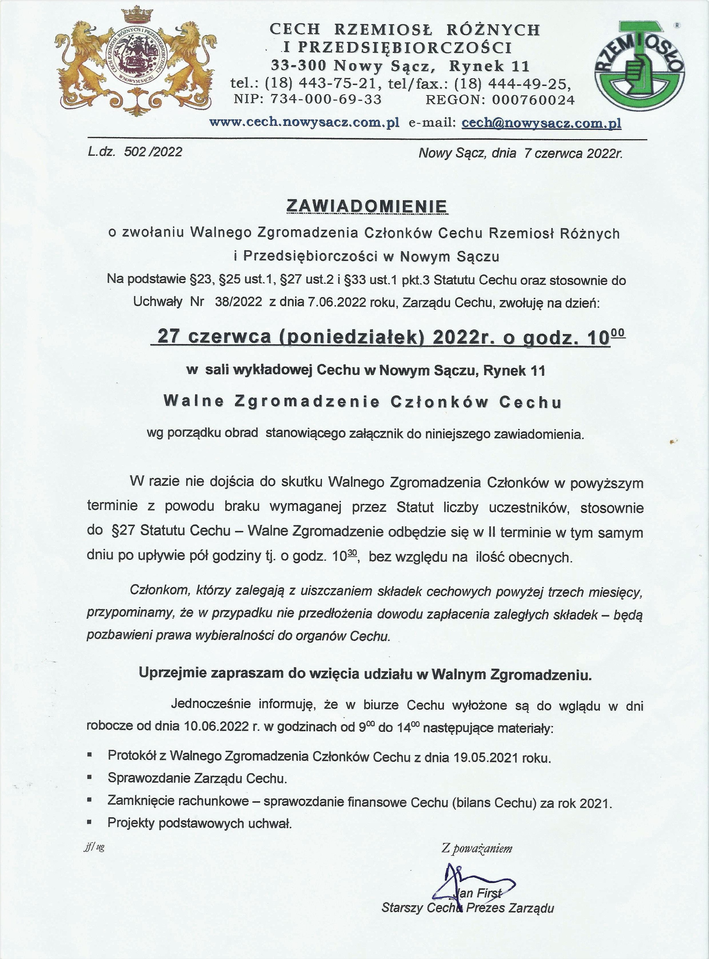 [2022-06-08] WALNE ZGROMADZENIE CZŁONKÓW CECHU - 27 czerwca 2022 r.